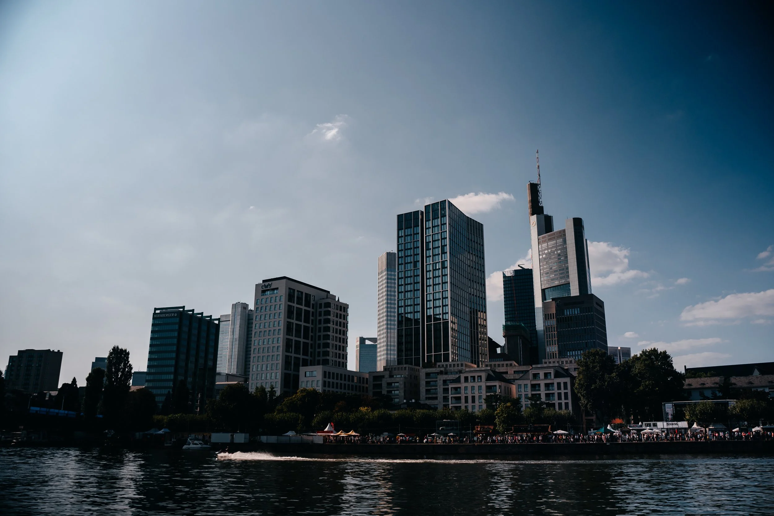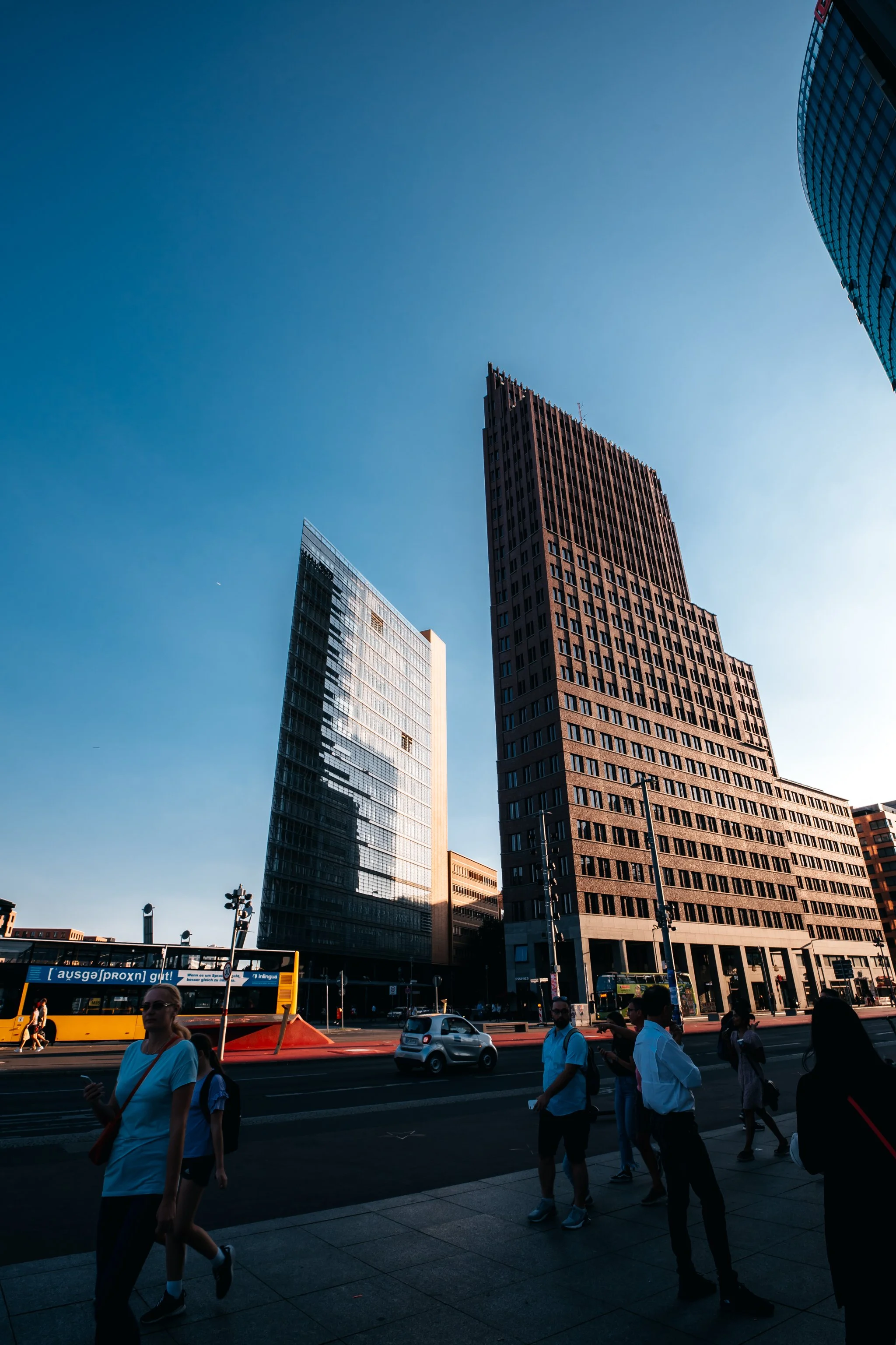 青空の下、多くのビルが立ち並ぶ都市の景色。人々と車が交差点に集まり、近代的な高層ビルが背景に広がる都市風景。