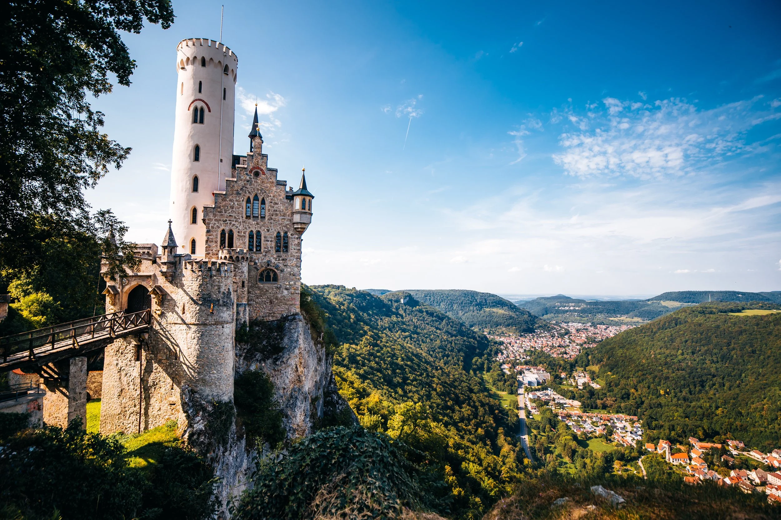 緑豊かな山の中にそびえるお城があり、青空と雲が広がる風景