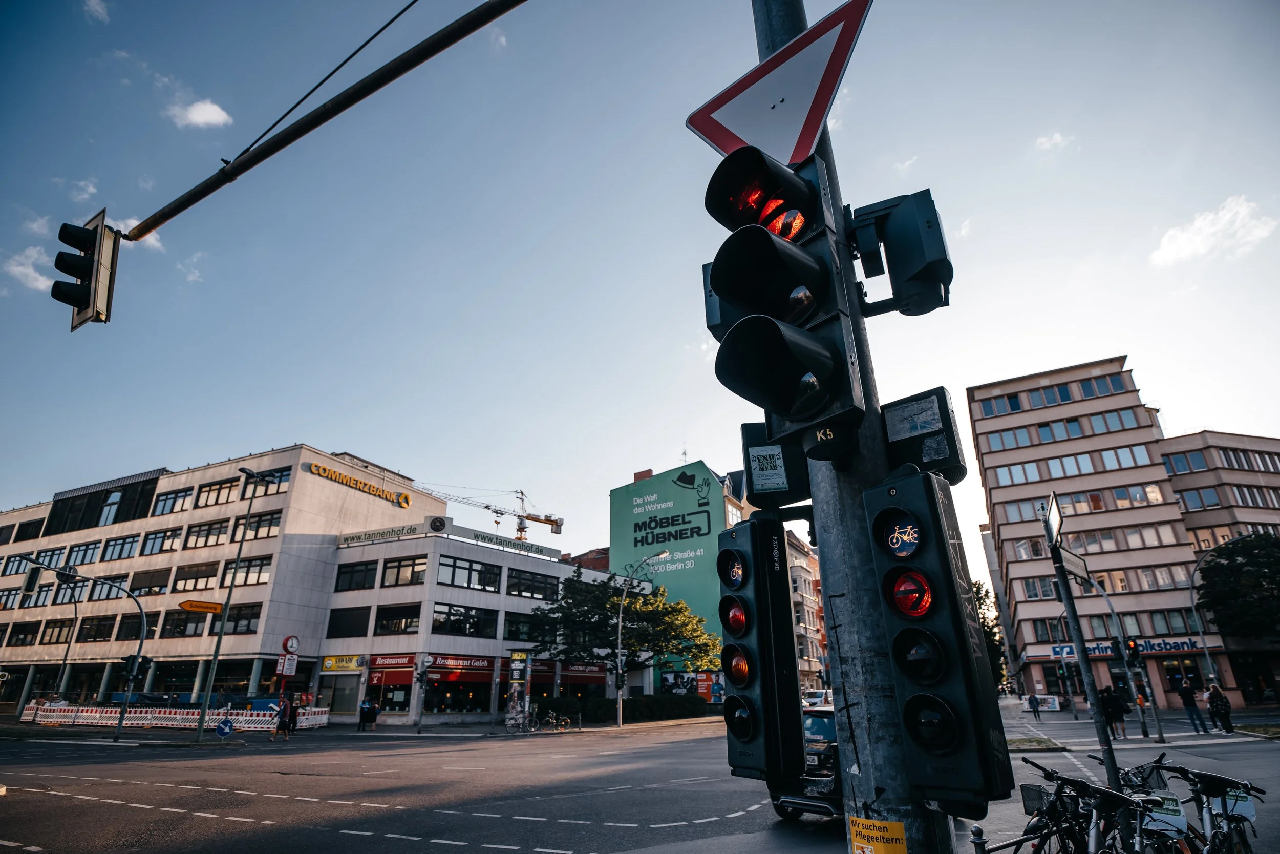 日没前の都市の交差点、ビルと広告看板が立ち並び、車や自転車が少なく静かな街並みの写真