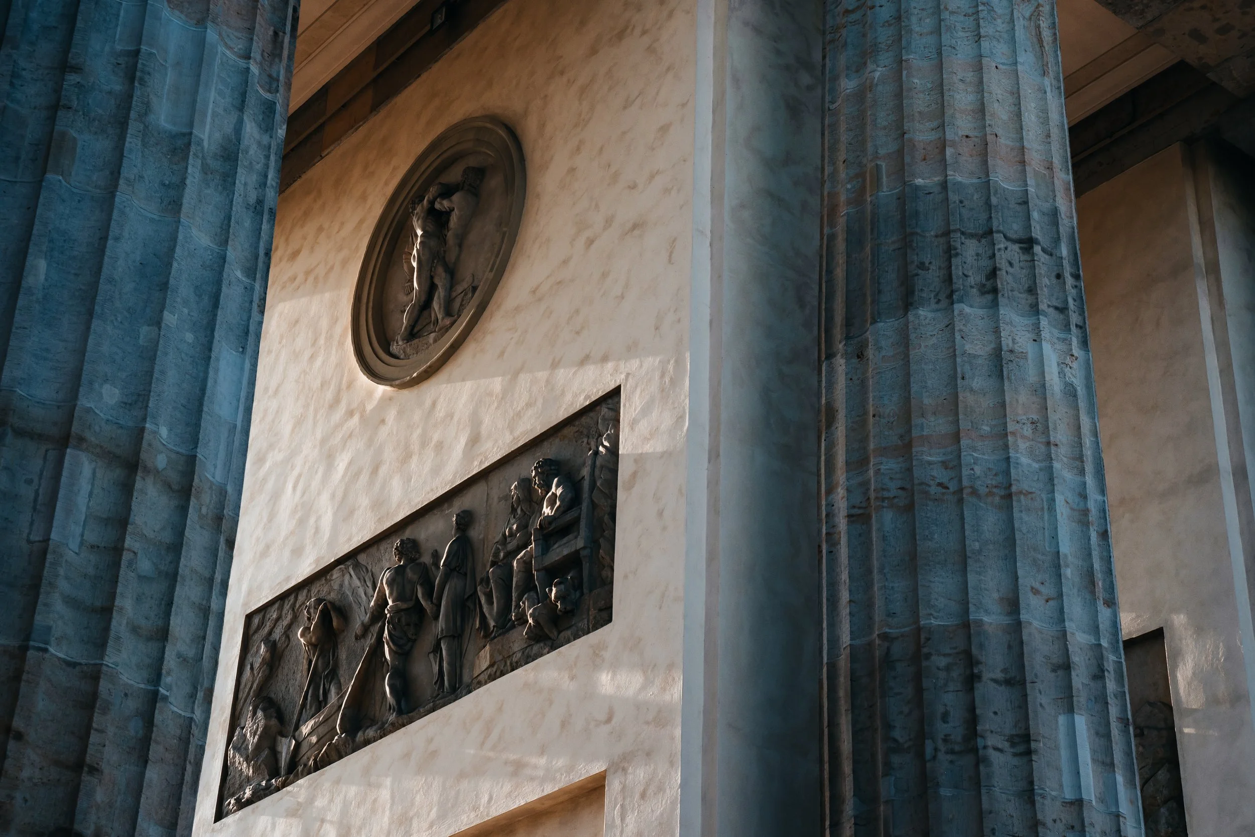 歴史的な建築物の壁面に彫刻とレリーフが施されている。