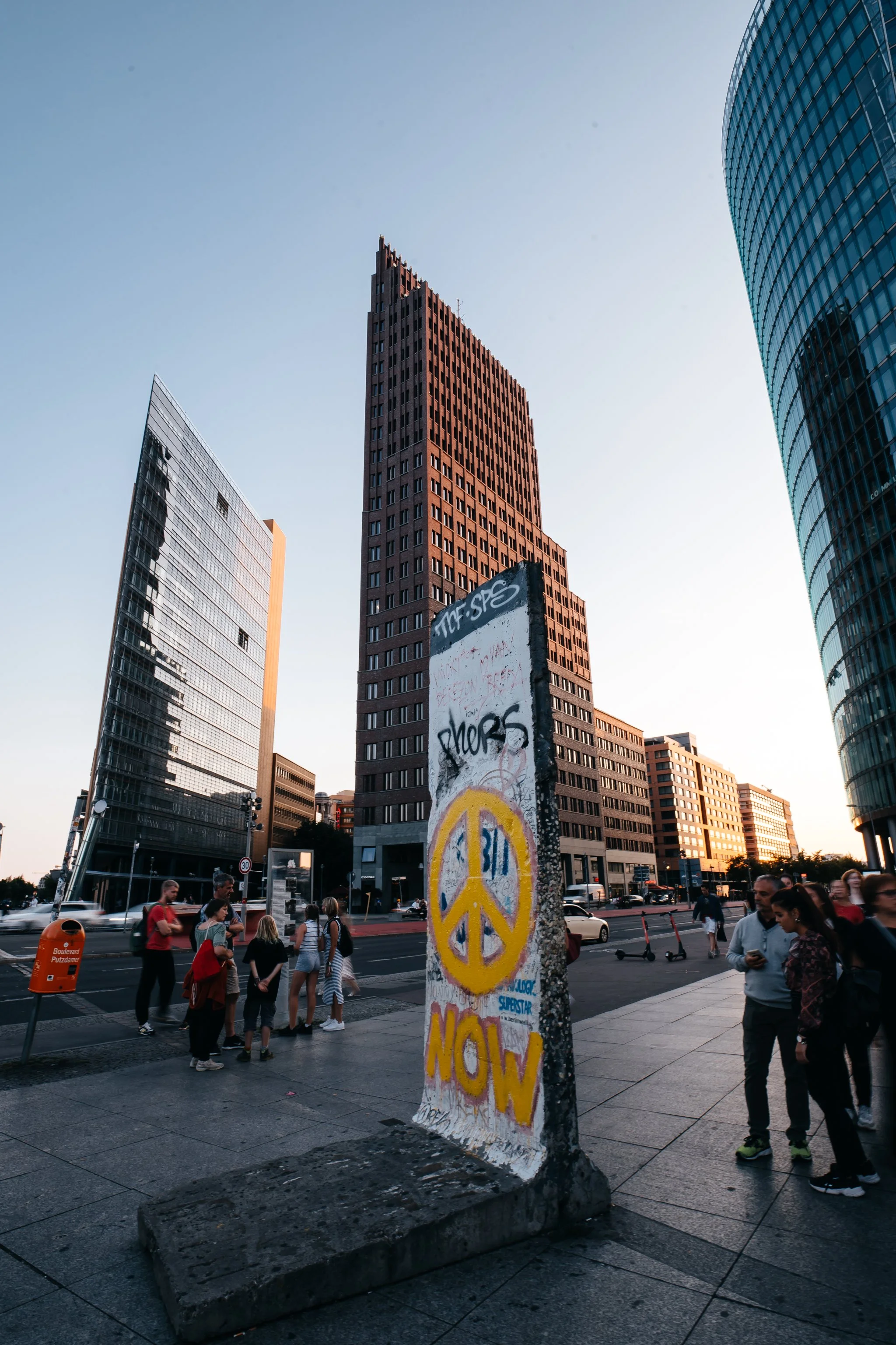 都市の交差点に置かれたコンクリートブロックに、黄色いピースマークと「NOW」と書かれた落書きがあり、多くの人々が行き交う風景。背景には高層ビルと交通信号機が見える。