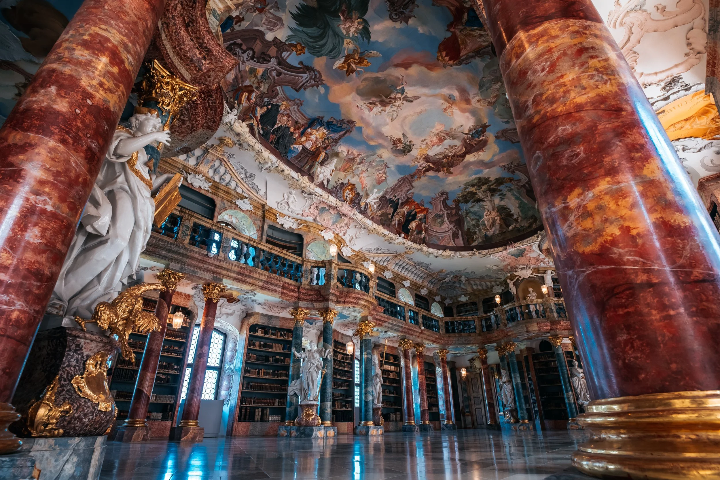 豪華な装飾が施されたバロック様式の図書館の内部。青と金の大理石の列柱、天井に描かれたフレスコ画、壮麗な彫像や書棚が並ぶ広々とした空間。