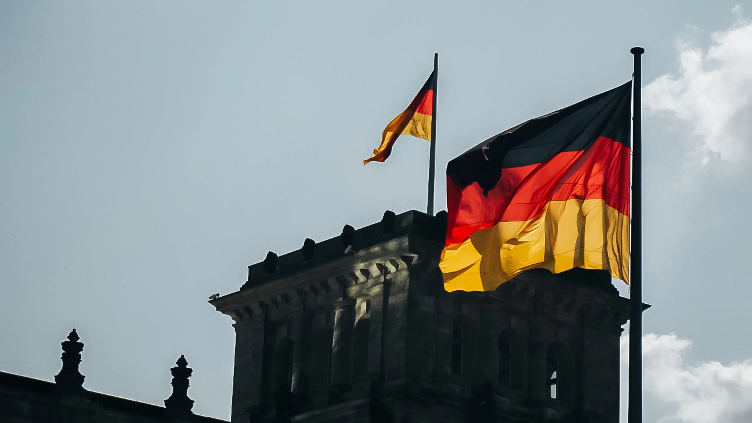 ベルリン塔と青空、上空を飛行機の飛行物体が通過し、飛行機の軌跡が見える